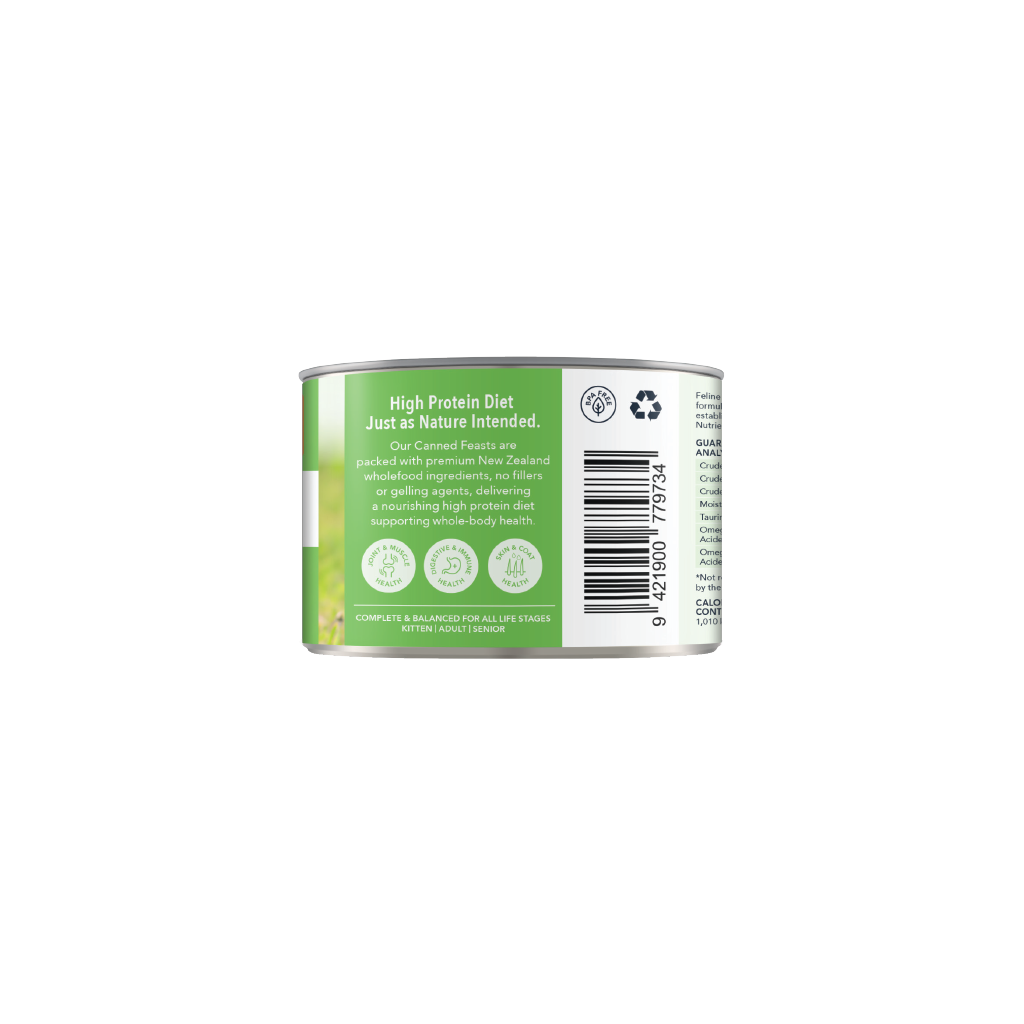 Made in New Zealand with cage-free Chicken and grass-fed, free-range Lamb, this rich-in-protein and highly palatable Chicken & Lamb diet is the perfect complete and balanced meal. Rich in taurine to support and maintain healthy eyes and, this Chicken & Lamb feast is a great source of protein and fats.