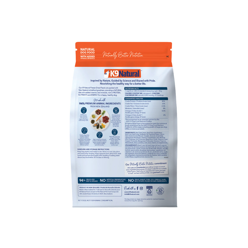 Our complete and balanced Freeze-Dried New Zealand Beef Feast contains 94% Grass-fed & Grass-finished Beef & Organs, with New Zealand Green Mussels, Flaxseed Flakes, Vegetables, Oils, Kelp, Vitamins, and Minerals in support of your dog's whole-body health.
